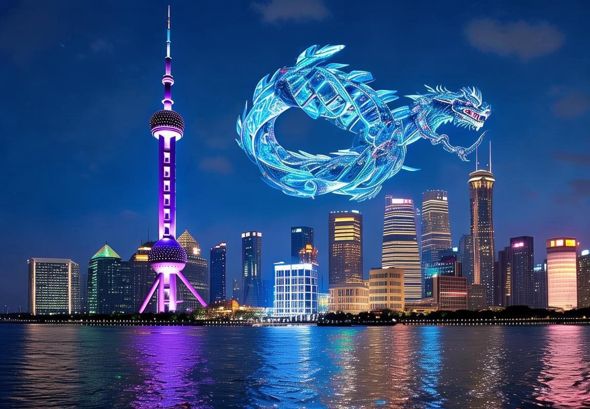 黄浦江畔华灯初上,英雄联盟全球总决赛主题灯光秀震撼登场。东方明珠与外滩万国建筑群披上蓝银色战袍,虚拟巨龙盘旋在夜空,与现实中江面游船交相辉映。